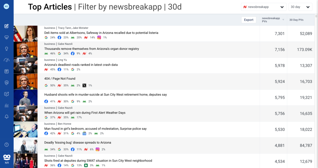 Here’s an example of sample data filtered by referral source Newsbreak on a 30-day view.